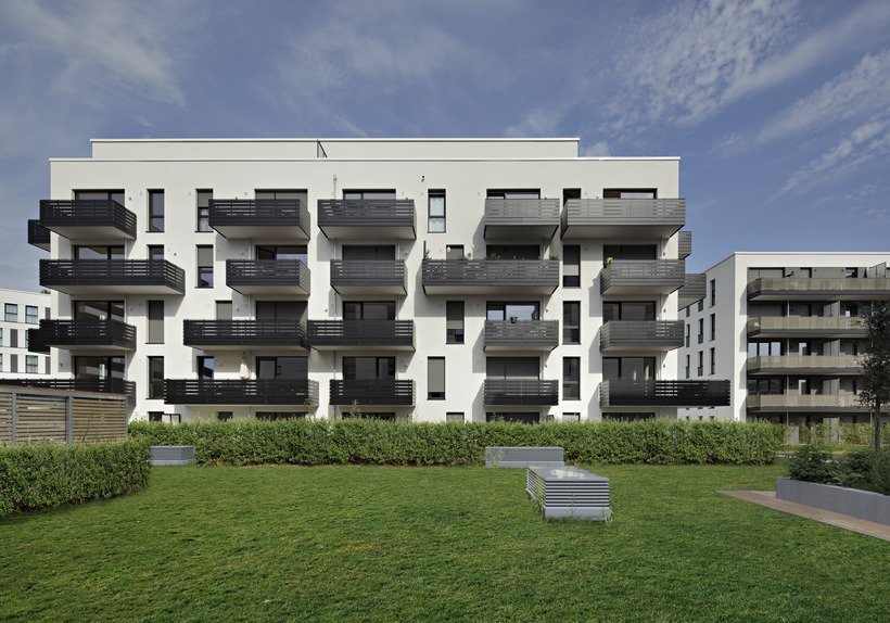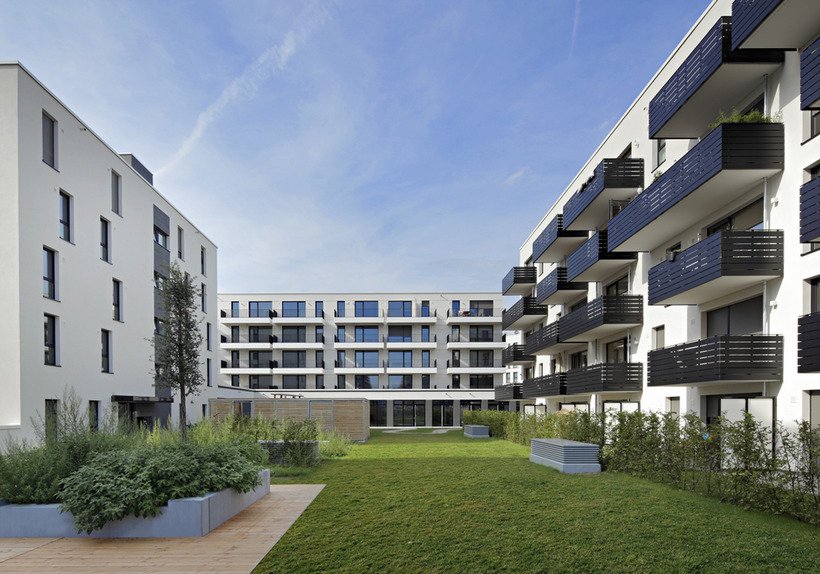 Im Inneren der fünf Häuser wurden verschiedene Wohnungsgrößen mit Holzparkettboden, bodentiefen Fenstern und hochwertiger Ausstattung umgesetzt. Jede der Wohnungen verfügt über einen Balkon, die Erdgeschosswohnungen zum Teil sogar über eigene kleine Gärten. Die Energieeffizienz des Ensembles wird in Anlehnung an den KfW-Effizienzhaus-Standard 55 definiert und geht damit weit über die gesetzlichen Mindestanforderungen der EnEV 2014 hinaus.