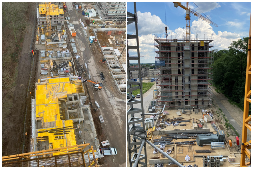 Der Rohbau der beiden 12-geschossigen Wohngebäude ist in den letzten 4 Monaten deutlich in die Höhe gewachsen. Auf dem insgesamt 2.598 m² großen Grundstück baut die REVITALIS zwei moderne Wohntürme mit rund 10.800 m² BGF, 105 Wohnungen und einer dazugehörigen Tiefgarage.