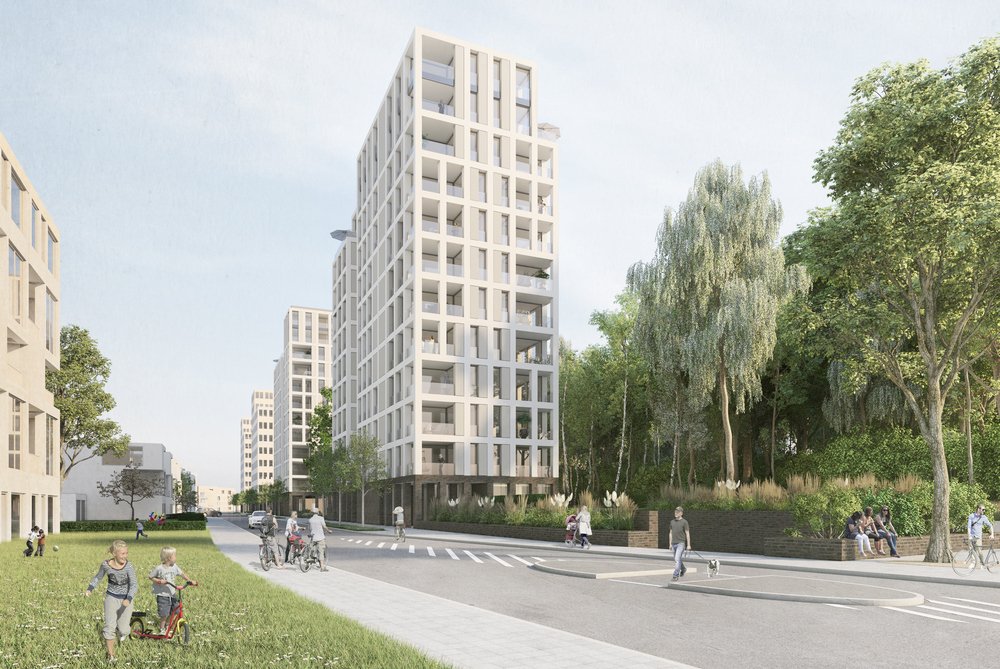 Die Wettbewerbssiegerentwürfe stammen vom Braunschweiger Büro Giesler Architekten. Die Außenanlagen mit Terrassenpark und Wiesenhain ergänzen die großzügige und öffentliche Quartiersparkanlage, die eine hohe Aufenthaltsqualität für künftige Bewohner und Besucher schafft.