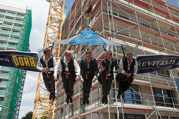 Für unsere Gäste hatten wir eine ganz besondere Überraschung parat: Wer mutig genug war, konnte sich mit einem AirEmotion in die Luft ziehen lassen und einen unvergesslichen Blick über unsere Baustelle sowie über die atemberaubende Dresdner City genießen.