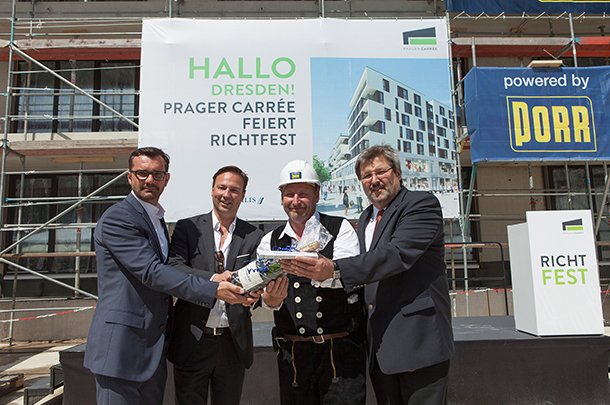 Nur zehn Monate nach der Grundsteinlegung haben wir gemeinsam mit der PORR Deutschland GmbH, im Beisein von Jörn Marx, Beigeordneter für Stadtentwicklung der Landeshauptstadt Dresden und weiteren Projektbeteiligten sowie geladenen Gästen das Richtfest für unser PRAGER CARRÉE gefeiert.