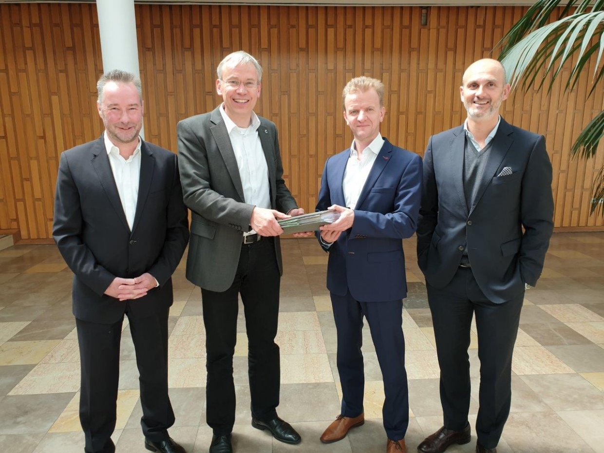 v.l.n.r.: Thomas Cromm (Vorstand REVITALIS REAL ESTATE AG), Kai Uwe Hirschheide (Stadtbaurat Wolfsburg), Mario Freye (Projektleiter REVITALIS REAL ESTATE AG), Marc Wirtz (Vorstand REVITALIS REAL ESTATE AG) // Foto: Stadt Wolfsburg