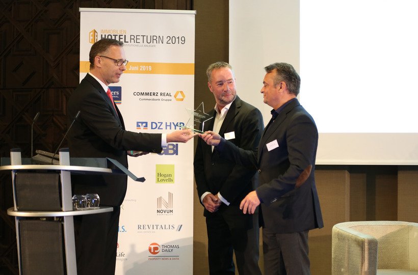 Oliver Strumpf, Leiter Fachbeirat HotelReturn (links) überreicht Thomas Cromm und Andreas Lipp (Vorstände REVITALIS REAL ESTATE AG) den Initiatorenpreis // Foto: Strumpf Eventmanagement