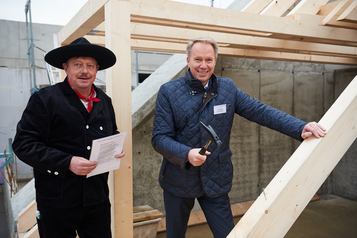Stefan Neumann hält den traditionellen Richtspruch und Alexander Kuhlendahl schlägt den letzten Nagel in den Dachbalken // Foto: Jeibmann Photographik
