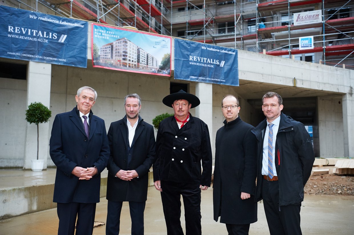 Nur fünfzehn Monate nach Baubeginn feiert die REVITALIS REAL ESTATE AG im Beisein von Bürgermeister Raoul Schmidt-Lamontain, Beigeordneter für Stadtentwicklung, Bau, Verkehr und Liegenschaften und weiteren Projektbeteiligten sowie geladenen Gästen das Richtfest des Wohnquartiers HAUS AM SCHAUSPIELGARTEN und freut sich über REWE als ersten Mieter und optimalen Quartiersversorger.